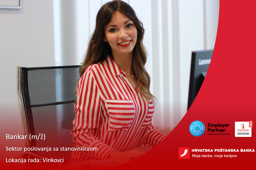 Hrvatska poštanska banka je banka u većinskom hrvatskom vlasništvu i s više od pola milijuna klijenata. Kontinuirano unaprjeđujemo naše poslovanje i stvaramo uvjete za bolji život u Hrvatskoj. Kako bismo podržali kontinuirani rast, u potrazi smo za motiviranim kandidatima koji žele sudjelovati i doprinijeti ostvarenju rekordnih rezultata, na radnom mjestu: