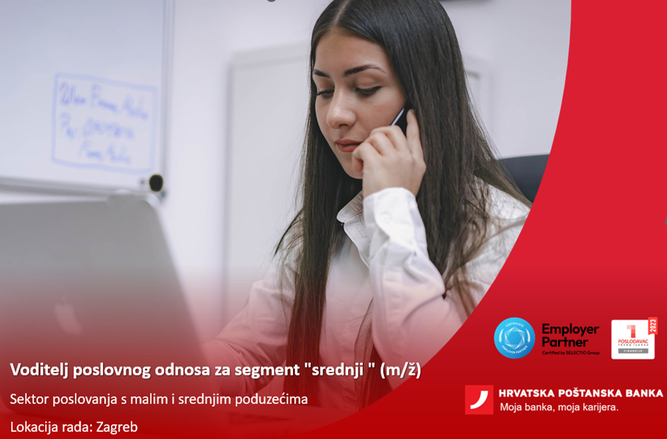 Hrvatska poštanska banka je banka u većinskom hrvatskom vlasništvu i s više od pola milijuna klijenata. Kontinuirano unaprjeđujemo naše poslovanje i stvaramo uvjete za bolji život u Hrvatskoj. Kako bismo podržali kontinuirani rast, u potrazi smo za motiviranim kandidatima koji žele sudjelovati i doprinijeti ostvarenju rekordnih rezultata, na radnom mjestu: